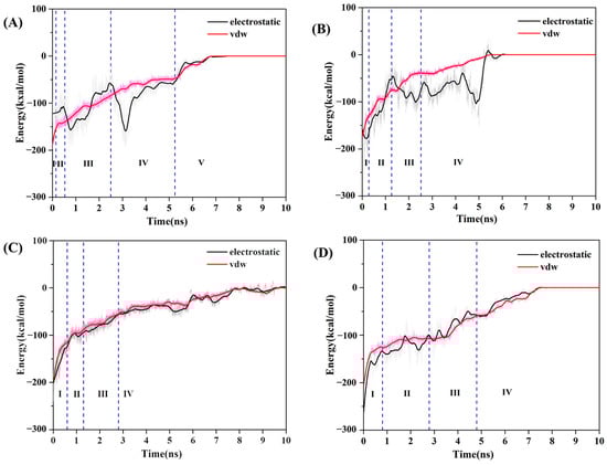 Changes of the energy between the boundary chain and template for (A) human brain system; (B) cofactor-tau system; (C) cofactor-free system in path 1; and (D) cofactor-free system in path 2. I–V represent the dissociation stages. The black lines represent electrostatic interactions, red lines represent van der Waals interactions, and blue dashed lines distinguish different stages.