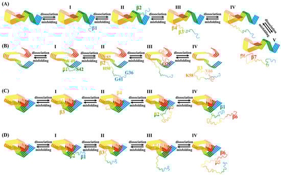 Since the dissociation of the boundary chain is the reverse process of template-induced monomer binding, the driving force for the continued misfolding of α-Syn monomers under template induction can be deduced by the resistance during the dissociation process. Therefore, changes in the contributions of the van der Waals (vdW) and electrostatic interactions between boundary chains and fibril interfaces during dissociation were analyzed (Figure 6). In the human brain system (Figure 6A), vdW interactions were mainly destroyed in the first two stages (I–II). In the third and fourth stages (III–IV), the electrostatic interactions were mainly destroyed. It is worth noting that there was a sharp peak in the electrostatic interaction energy in the fourth stage, which indicates that the dissociation of β5 (residues 58–66) needed to overcome stronger electrostatic interactions. Residues 58-66 contained more charged residues (such as Lys58, Glu61 and Lys60), so they tended to form H-bond interactions. In addition, it can also be seen from the above residue network analysis that the H-bond interactions were relatively dense in this stage (Figure 5-IV), which was also the reason why the electrostatic interactions became the main resistance. In the fifth stage (V), the electrostatic and vdW interactions were damaged in a similar degree. In general, the boundary chain was easy to dissociate from β1 at the N-terminal and then dissociate sequentially along the direction from β2 to β7 (Figure 7A). Conversely, the binding process of the incoming monomer with template was successively from C-terminal (β7) to N-terminal (β1). During the misfolding process, hydrophobic and electrostatic interactions first drove the binding of the α-Syn monomer to the template, then the electrostatic interactions stabilized the intermediates, and finally relied on the hydrophobic interactions to complete the misfolding process.