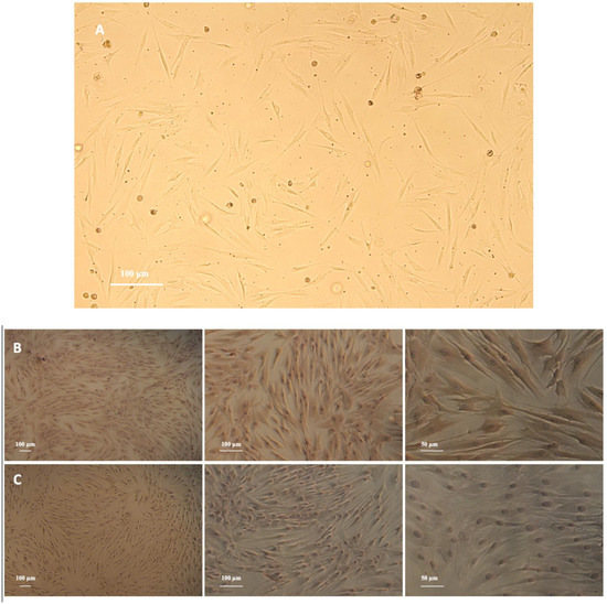 PDLFs were spindle shaped and arranged in a radial pattern (Figure 1A). Immunohistochemical characterization revealed that PDLFs had positive anti-vimentin staining and negative anti-keratin staining (Figure 1B,C).