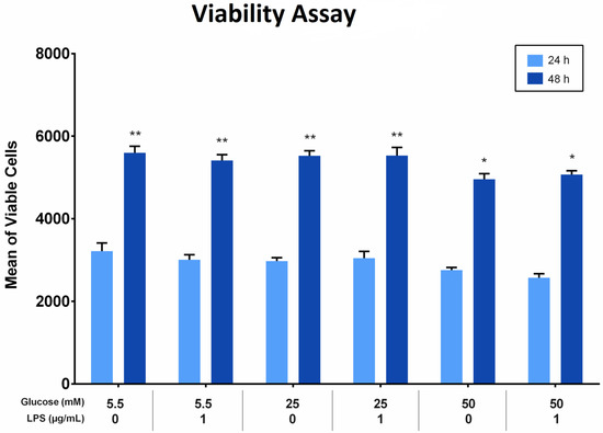 The viability of periodontal ligament fibroblast (PDLFs) using Alamar blue assay at 24 and 48 h. The cells were challenged with glucose concentrations with/without 1 µg/mL LPS. Asterisks (**) indicate p < 0.05 compared with all other groups with/without LPS at 24 and 48 h. Asterisk (*) indicates p < 0.05 compared with 5.5 mM, 25 mM, and 50 mM glucose with/without LPS at 24 h. (LPS; lipopolysaccharide).