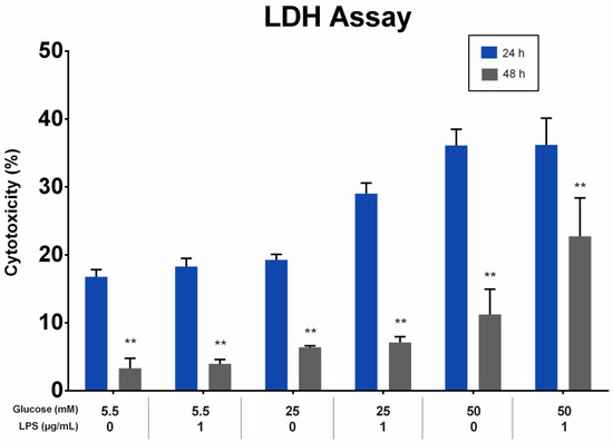 The cytotoxicity effect on periodontal ligament fibroblast (PDLFs) using LDH assay at 24 and 48 h. The cells were challenged with glucose concentrations with/without 1 µg/mL LPS. Asterisks (**) indicate p < 0.01 compared with the same glucose concentration at 24 h. (LDH; Lactic Acid Dehydrogenase, LPS; lipopolysaccharide).