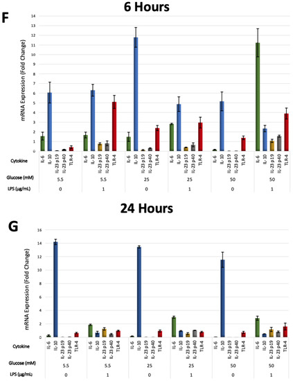 (A) IL-6 mRNA expression (fold change) at 6 and 24 h. IL-6 was significantly up-regulated at 6 h in 50 mM glucose with LPS-stimulated cells (p < 0.05). Asterisks (**) indicate p < 0.01 compared with all other IL-6 expressions at different times and glucose concentrations. (IL-6; Interleukin-6, mRNA; messenger RNA, LPS; lipopolysaccharide). (B) IL-10 mRNA expression (fold change) at 6 and 24 h. IL-10 was significantly up-regulated in LPS-free cells (p < 0.05). Asterisks (**) indicate p < 0.05 compared with all other IL-10 expressions. Asterisk (*) indicates p < 0.05 compared with IL-10 expressions in LPS-stimulated groups at 24 h. (IL-10; Interleukin-10, mRNA; messenger RNA, LPS; lipopolysaccharide). (C,D) IL-23 p19/p40 expression (fold change) at 6 and 24 h. IL-23 p19/p40 was significantly up-regulated in LPS-challenged cells (p < 0.05). Asterisks (**) indicate p < 0.05 compared with all other IL-23 p19/p40 expressions without LPS stimulation. (IL-23 p19; Interleukin-23 p19, IL-23 p40; Interleukin-23 p40, mRNA; messenger RNA, LPS; lipopolysaccharide). (E) TLR-4 expression (fold change) at 6 and 24 h. TLR-4 was significantly up-regulated in LPS-stimulated cells and in 25 and 50 mM glucose-treated cells at 6 h (p < 0.05). Asterisks (**) indicate p < 0.05 compared with TLR-4 expressions at 24 h in the same group. Asterisk (*) indicates p < 0.05 compared with all other TLR-4 expressions at 24 h. (TLR-4; Toll-like receptor-4, mRNA; messenger RNA, LPS; lipopolysaccharide). (F) Six-hour mRNA expressions (fold change) of IL-6, IL-10, IL-23 (p19/p40), and TLR-4. (IL-6; Interleukin-6, IL-10; Interleukin-10, IL-23 p19; Interleukin-23 p19, IL-23 p40; Interleukin-23 p40TLR-4; Toll-like receptor-4, mRNA; messenger RNA, LPS; lipopolysaccharide). (G) Twenty-four-hour mRNA expressions (fold change) of IL-6, IL-10, IL-23 (p19/p40), and TLR-4. (IL-6; Interleukin-6, IL-10; Interleukin-10, IL-23 p19; Interleukin-23 p19, IL-23 p40; Interleukin-23 p40TLR-4; Toll-like receptor-4, mRNA; messenger RNA, LPS; lipopolysaccharide).