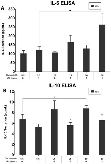 3.6. LPS and High-Glucose Concentrations Induce Interleukin-6 Secretion but Not Interleukin-10