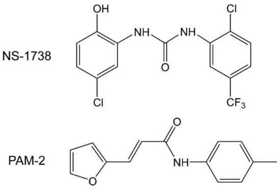 Figure 1. Structural formulas of N-(5-Cl-2-hydroxyphenyl)-N′-[2-Cl-5-(trifluoromethyl)phenyl]-urea (NS-1738) and (E)-3-(furan-2-yl)-N-(p-tolyl)-acrylamide (PAM-2).