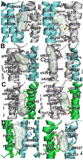 The docking experiments were based on the structure of the human α1β2γ2 receptor (PDB: 6X3T) [23]. In the APO 6X3T structure, both NS-1738 and PAM-2 were able to dock in the anesthetic binding sites at the β+/α−, α+/β−, and γ+/β− interfaces. In addition, the compounds were shown to bind at a homologous site at the α+/γ− interface. The structure figures with docked α7-PAMs are given in Figure 3. The corresponding PDB files are provided in the Supplementary Materials. The amino acid sequences of the human and rat α1 subunits differ. The human subunit has one extra residue (a leucine in position 4 in the mature subunit) in the amino-terminal region but is otherwise identical to rat α1. For convenience and consistency with electrophysiological data, we used the rat numbering when discussing specific residues in the α1 subunit (hence, the true numbering in human α1 = the provided rat numbering + 1).