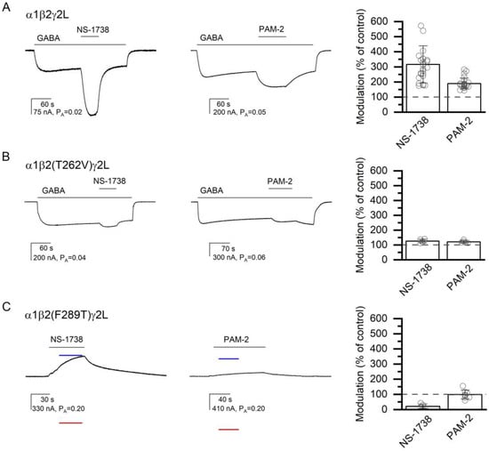 Figure 4. The modulatory effects of NS-1738 and PAM-2. The current traces show the potentiating effects of 50 µM NS-1738 or PAM-2 in the α1β2γ2L receptor activated by 2 µM GABA (A), or in the α1β2(T262V)γ2L receptor activated by 4 µM GABA (B). Panel (C) shows direct activation by NS-1738 or PAM-2 of the constitutively active α1β2(F289T)γ2L receptor. The blue and red lines show the current levels in the same cell in the presence of 200 µM picrotoxin (assumed PA = 0) or 1 mM GABA + 50 µM propofol (assumed PA = 1), respectively. The modulatory effects are summarized in the column graphs. In (A,B), modulation is calculated as the amplitude of the peak response to GABA + α7-PAM divided by the amplitude of the response to GABA alone at the time of peak response to GABA + α7-PAM. In (C), modulation is calculated as the ratio of the estimated PA in the presence and absence of α7-PAM. Drug application durations are given with horizontal lines.