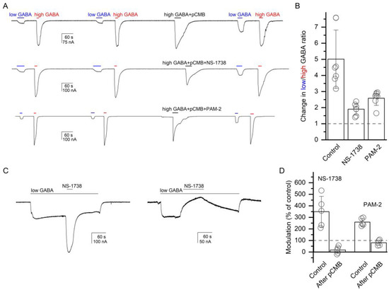 Cysteine-modification experiments were done by exposing a wild-type (control) or a cysteine-mutated receptor to p-chloromercuribenzoic acid (pCMB). Successful modification of a cysteine residue was deduced from irreversible alteration of receptor function following the application of pCMB [29,30,31]. The pCMB concentration was 25 µM and the application duration was 30 s. pCMB was applied in the presence of 1 mM GABA, and all drug applications were followed by a 4–5 min wash in ND96. In modification-protection experiments, the cells were exposed to the protecting agent (NS-1738 or PAM-2) for 60 s, followed by a 30 s application of pCMB + GABA + protective agent.