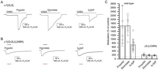 Figure 6. The modulatory effects of propofol, etomidate, and 3α5βP. The current traces show the potentiating effects of 50 µM propofol, 50 µM etomidate, or 10 µM 3α5βP in the α1β2γ2L receptor activated by 2–4 µM GABA (A) or the direct-activating effects of the compounds in the α1β2γ2L(L246N) receptor (B). The blue and red lines show the current levels in the same cell in the presence of 200 µM picrotoxin (assumed PA = 0) or 1 mM GABA + 50 µM propofol (assumed PA = 1), respectively. The modulatory effects are summarized in the column graph (C). The effects of the compounds are significantly reduced in the mutant receptor. In (A), modulation is calculated as the amplitude of the peak response to GABA + α7-PAM divided by the amplitude of the response to GABA alone at the time of peak response to GABA + α7-PAM. In (B), modulation is calculated as the ratio of the estimated PA in the presence and absence of α7-PAM. Drug application durations are given with horizontal lines.