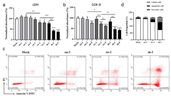 The in vitro CAP device is applied to MC38 cells, followed by cytotoxicity and proliferation assays (Figure 2). The intracellular LDH levels which represent the cell survival rates are inversely proportional to the cytotoxicity (Figure 2a). In addition, a CCK-8 assay is employed to evaluate the cell proliferation activity (Figure 2b). Compared to the control group, the tw-3, tw-5, th-1, th-3, and th-5 PT groups exhibit decreased survival rates in the tumor cells. The MC38 cell proliferation activity decreases dramatically in the high CAP treatment-generated ROS/RNS dose PT group, particularly the th-3 and th-5 groups. The cytotoxicity in the MC38 cells increases with a concurrent decrease in the cell proliferation activity, as the CAP treatment-generated ROS/RNS doses increase (Figure 2a,b). Notably, the cytotoxicity is higher in the th-3 group than the tw-5 group, suggesting that increasing the frequency of CAP treatment is an efficient strategy in CAP oncotherapy (Figure 2a,b).