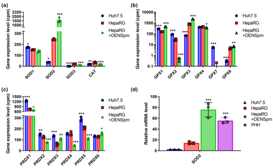 Relative mRNA levels of ROS-scavenging enzymes in hepatoma Huh7.5 cells, hepatocyte-like HepaRG cells, and in HepaRG cells treated with DENSpm, assessed by RNAseq analysis. (a) Levels of superoxide dismutases (SOD) and catalase (CAT) mRNA, (b) levels of glutathione peroxidases (GPx) mRNA, and (c) levels of peroxiredoxins mRNA. (d) Relative levels of superoxide dismutase 2 (SOD2) mRNA in these cells and PHH assessed by RT-qPCR and normalized to the levels of GUS mRNA. Bars are means ± S.D. Statistical significance was analyzed by ANOVA with Tukey’s post hoc test. Statistical significance is presented for the comparison of cells with the differentiated HepaRG cells. * p < 0.05, ** p < 0.01, and *** p < 0.001.