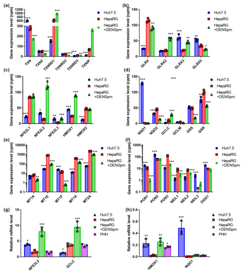 Relative mRNA levels of antioxidant enzymes and proteins that protect DNA and lipids from oxidative damage in hepatoma Huh7.5 cells, hepatocyte-like HepaRG cells, and in HepaRG cells treated with DENSpm, assessed by RNAseq analysis. Gene expression levels of thioredoxins (TRX) and thioredoxin reductases (TRXR) (a), glutaredoxins (GLRX) (b), Nrf2-dependent enzymes (c,d), metallothioneins (MT) (e), and paraoxonases (PON) and DNA glycosylases (f). (g,h) Relative levels of the mRNA of the antioxidant enzymes in these cells and PHH assessed by RT-qPCR and normalized to the levels of GUS mRNA. Bars are means ± S.D. Statistical significance was analyzed by ANOVA with Tukey’s post hoc test. Statistical significance is presented for the comparison of cells to differentiated HepaRG cells. * p < 0.05, ** p < 0.01, *** p < 0.001.