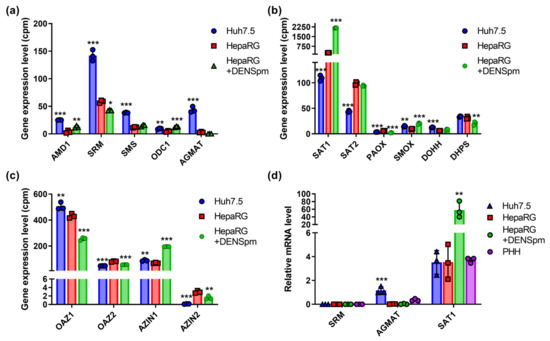 Polyamine biosynthesis is regulated by enzymes encoded by the ODC, spermidine and spermine synthases (SRM and SMS), and AMD genes, while catabolism is regulated by SAT1, SMOX, and acetylpolyamine oxidase (PAOX) [12]. Transcriptome analysis revealed that in Huh7.5 hepatoma cells, the expression of polyamine biosynthesis genes (SRM, SMS, and AMD) was increased, while in hepatocyte-like HepaRG cells, the expression of the SAT1 gene involved in the degradation of spermine and spermidine was increased (Figure 4a,b). Similar changes were found for the SAT2 isoform (Figure 4b) that encodes a functionally inactive protein [49]. It is noteworthy that RT-qPCR failed to verify higher levels of SAT1 mRNA in HepaRG cells compared to Huh7.5 (Figure 4d). At the same time, the level of the mRNA of polyamine oxidases PAOX and SMOX in two cell lines remained very low and differed insignificantly. Similar levels of expression were observed for the isoforms of regulatory ornithine decarboxylase antizyme (OAZ) and the antizyme inhibitor (AZIN) (Figure 4c). The only exception was AZIN2—the minor variant of the protein. The activation of polyamine catabolism decreased levels of OAZ1 and increased levels of AZIN1, presumably to allow the induction of the biosynthetic pathway. One should note that regulation by OAZ1 is likely to be regulated in post-transcriptional step, as functional antizyme is produced upon a polyamine-dependent frameshift during the translation of its mRNA [50] and, probably, during its polyamine-dependent dimerization [51]. In Huh7.5 cells, the mRNA of the agmatinase (AGMAT) was also detected, which was not observed in the non-tumor HepaRG line, as was revealed through both RNAseq and RT-qPCR analysis (Figure 4a,d). The treatment of HepaRG cells with DENSpm and the concomitant activation of SAT1 transcription also significantly increased the level of ODC and SMOX expression. Finally, there were only slight differences in the expression of genes involved in the unique polyamine-dependent post-translational modification of translation initiation factor eIF5a, deoxyhypusine synthase (DHPS), and deoxyhypusine hydroxylase (DOHH) (Figure 4b).