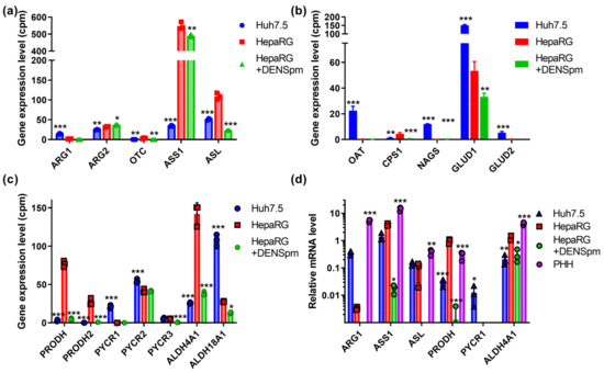 Relative mRNA levels of urea cycle and proline metabolizing enzymes in hepatoma Huh7.5 cells, hepatocyte-like HepaRG cells, and HepaRG cells treated with DENSpm, assessed by RNAseq analysis. Levels of the mRNA of the encoding enzymes of the urea cycle (a) or of the proline metabolism (b,c). (d) Relative levels of mRNA of metabolic genes in these cells and PHH assessed by RT-qPCR and normalized to the levels of GUS mRNA. Bars are means ± S.D. Statistical significance was analyzed by ANOVA with Tukey’s post hoc test. Statistical significance is presented for the comparison of cells to differentiated HepaRG cells. * p < 0.05, ** p < 0.01, *** p < 0.001.