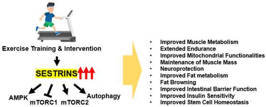 - Kim, M.; Sujkowski, A.; Namkoong, S.; Gu, B.; Cobb, T.; Kim, B.; Kowalsky, A.H.; Cho, C.S.; Semple, I.; Ro, S.H.; et al. Sestrins are evolutionarily conserved mediators of exercise benefits. Nat. Commun. 2020, 11, 190. [Google Scholar] [CrossRef]