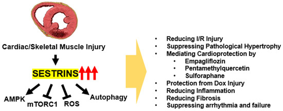 Sestrins were also shown to be important in the context of acute kidney injury (AKI)-associated cardiac damage and dysfunction. AKI can induce heart damage through oxidative stress, and Sestrins can suppress the damage. Experiments using cardiomyocyte-specific Sestrin2-knockout mice showed that metformin rescues AKI-induced cardiac injury through Sestrins and can improve a variety of indications, including systolic and diastolic function, fibrotic and cellular damage, and mitochondrial function. Importantly, metformin substantially upregulated Sestrin2 expression, suggesting that Sestrin2 mediates the cardioprotective effects of metformin [74].