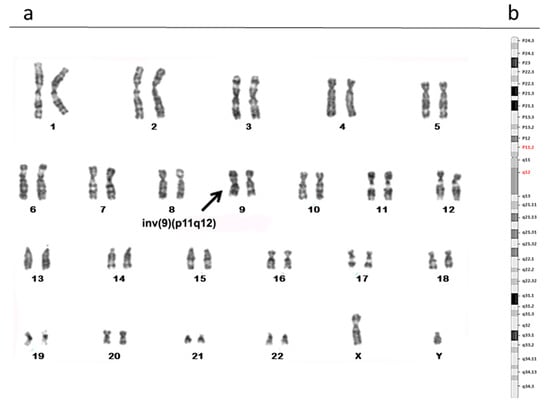 Karyotype analysis showing a pericentric inversion of chromosome 9: 46, XY, inv(9) (p11q12) (a). Karyogram including the bands of chromosome 9; in red those involved in the rearrangement (b).