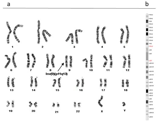 Karyotype analysis showing a pericentric inversion of chromosome 9: 46, XY, inv(9) (p11q13) in a heterozygous condition (a). Karyogram including the bands of chromosome 9; in red those involved in the rearrangement (b).