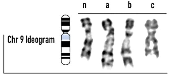 Polymorphic chromosome 9 variant 9qh (n: normal; a: qh++; b: qh+; c: qh−).