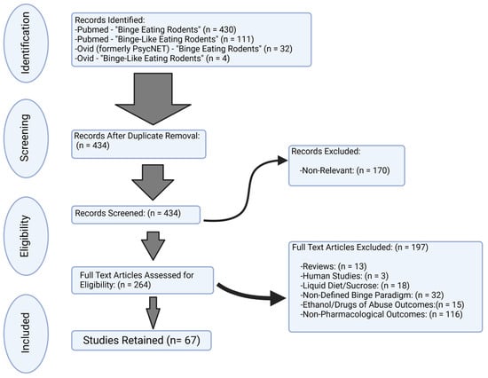 Flow chart for inclusion/exclusion of peer-reviewed studies. In accordance with Preferred Reporting Items for Systematic Reviews and Meta-Analyses (PRISMA) guidelines, a total of 67 studies were retained for the examination of pharmacological or compound assessment of binge-like eating behavior in rodents.