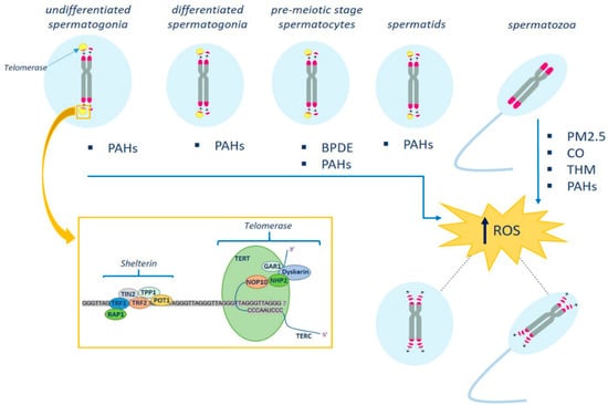 Schematic representation of the effects of environmental pollutants on telomere structure in male germ cells. Telomerase activity ensures that telomere length is maintained at maximum levels during spermatogenesis. Telomerase levels are high in undifferentiated spermatogonia, and progressively decrease in spermatocytes and spermatids until inactivation in mature spermatozoa. The latter have the longest telomeres. Environmental pollutants, by increasing oxidative stress, may act on germ cell telomere length and telomere-associated proteins. In the box are shown the telomerase and shelterin complexes (see text for details). PM2.5, particulate matter; THM, trihalomethanes; PAHs, polycyclic aromatic hydrocarbons; BPDE, benzo[a]pyrene—dihydrodiol-9,10-epoxide.