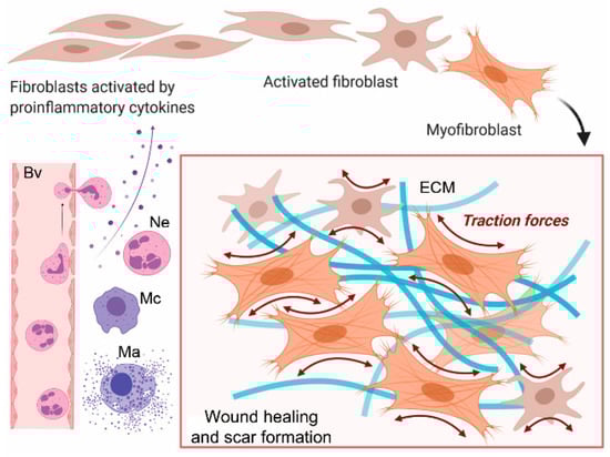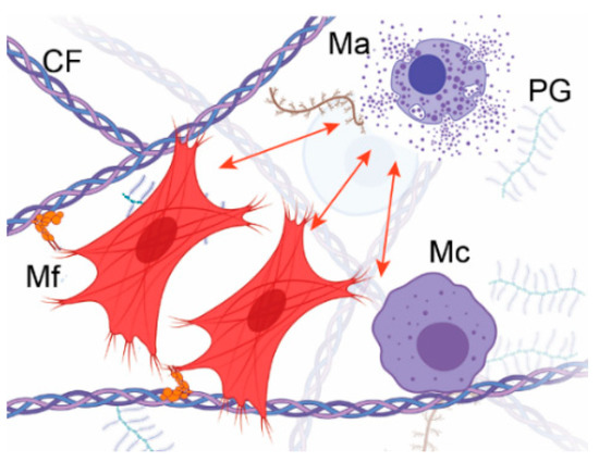 Myofibroblasts interact with inflammatory cells, including macrophages and mast cells. These cells influence fibroblast activities by secreting TGF-β1, PDGF, vascular endothelial growth factor (VEGF), IL-6, and IL-13. In turn, fibroblasts impact the macrophages’ phenotype and function by changing the physical properties of the ECM [31].