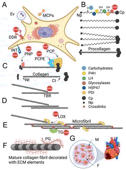 Figure 3. A schematic depicting crucial elements of mechanisms that contribute to the formation of collagen-rich, stiff matrices that promote excessive scarring. The STOP signs indicate the elements whose blocking is associated with anti-fibrotic effects. (A) A fibroblastic cell that includes discoidin domain receptors (DDR) and integrins (INT). Matricellular proteins (MCPs) and extracellular vesicles (Ev) are also indicated. (B) Intracellular biosynthesis of procollagen molecules formed by trimerization of individual procollagen chains. Crucial collagen-modifying enzymes include prolyl 4-hydroxylase (P4H), lysyl hydroxylase (LH), and glycosylases. Moreover, heat-shock protein 47 (HSP47) and protein disulfide isomerase (PDI) exemplify protein chaperones participating in procollagen formation. (C) Extracellular processing of procollagen propeptides with procollagen N proteinase (PNP) and procollagen C proteinase (PCP), whose activity is accelerated by PCP enhancer (PCPE). The N-terminal (Np) and the C-terminal (Cp) propeptides are also indicated. The N-terminal (Nt) and the C-terminal (Ct) telopeptides are also indicated. (D) Site-specific self-assembly of collagen molecules into a fibril; the assembly is driven by the interaction of collagen telopeptides with an interacting partner’s telopeptide-binding region (TBR). (E) A depiction of a collagen microfibril, in which collagen molecules undergo cross-linking catalyzed by lysyl oxidases (LOX) and transglutaminases (TG). (F) A mature collagen fibril associated with other structural macromolecules, e.g., proteoglycans (PG). (G) An example of a fibrotic site that affects an injured organ. In addition to muscle cells (M), a magnified insert shows fibroblasts (F) embedded in collagen-rich fibrotic tissue.