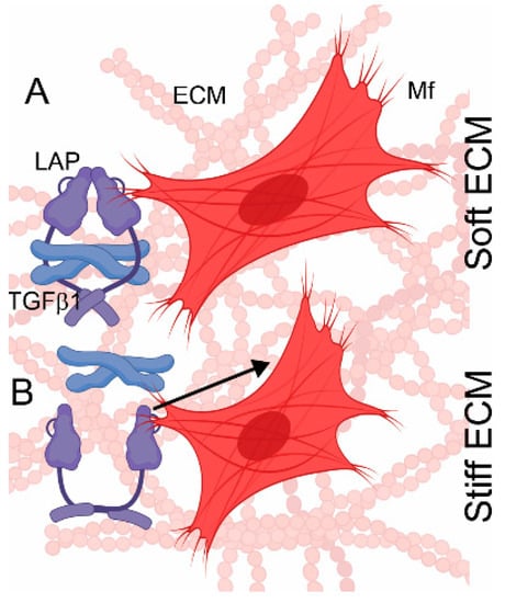Figure 5. A depiction of TGF-β1 activation by the mechanical forces (arrow) generated by myofibroblasts (Mf) embedded in soft ECM (A) or stiff ECM (B). TGF-β1 and latency-associated protein (LAP) are indicated.