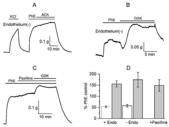 Given the complex response of PA to the TRPV4 agonist, the next task was to find out the mechanisms involved. It was shown that TRPV4 channels are highly expressed in vessel endothelium, and activation of endothelial TRPV4 evokes vasodilatation [54]. Thus, it could be assumed that the relaxation phase was due to the activation of endothelial TRPV4 channels. However, we found that endothelium-denuded arteries, as confirmed using the acetylcholine test (Figure 2A), responded the same way as intact vessels. In vessels pre-contracted with PhE, GSK1016790A caused relaxation to 57 ± 6% followed by contraction to 175 ± 33% (n = 5, N = 3), which was only slightly higher (but not statistically significantly, p = 0.56) in endothelium-denuded samples compared to intact tissue (Figure 2B,D). These results indicate the involvement of smooth muscle TRPV4 channels rather than endothelial ones in the development of biphasic reactions of the PA.