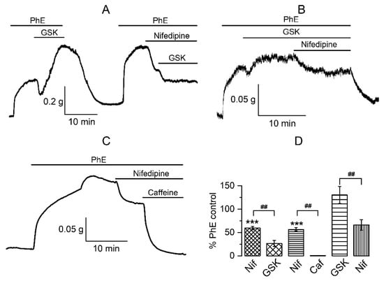 The contraction phase of the biphasic response is sensitive to the calcium channels’ blocker and may involve the RyRs-dependent signalling pathways. (A) The selective blocker of CaL, nifedipine (10 μM), prevents the development of contraction phase in response to GSK1016790A (0.3 μM) while accentuating the relaxation phase. (B) The contraction phase induced by GSK1016790A is inhibited by nifedipine. (C) Caffeine (10 mM) acts the same way as GSK1016790A in PA pretreated with PhE and nifedipine. (D) Comparative analysis of GSK1016790A (n = 6, N = 3) and caffeine (n = 4, N = 2) action on intact PA SM pretreated with PhE and nifedipine, as well as nifedipine effect on intact PA SM pretreated with PhE and GSK1016790A (n = 5, N = 4). Data are presented as percentage of the PhE-induced response (mean ± SEM). *** p < 0.0001 compared to 100% by 1 sample t-test; ## p < 0.001 by ANOVA with Tukey’s post hoc test. In all these experiments, pulmonary artery rings with intact endothelium were used.