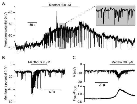 In NSCCs such as TRPs, currents typically reverse at potentials in the range from −10 to 0 mV. Interestingly, in a few atypically depolarised cells with resting potentials greater than −20 mV (n = 4), menthol produced only an increase in the amplitude and frequency of spontaneous hyperpolarisations. These were associated with an increase in [Ca2+]i measured in the same cell (Figure 5B,C). These findings directly confirm the activation of non-selective cation conductance (e.g., current with a reversal potential of about −10 mV), rather than a decrease in potassium conductance, as the cause of membrane depolarisation.