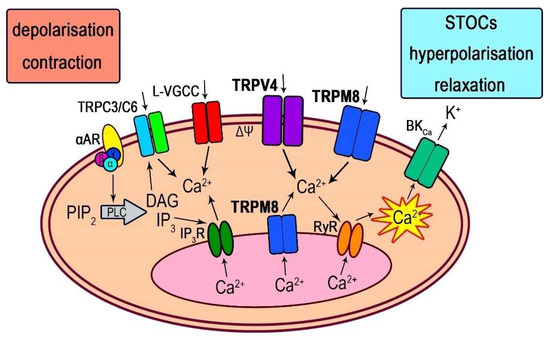 TRPV4 could be a therapeutic target for the treatment of cardiovascular pathologies. Current research shows that activation of the TRPV4 channel enhances vascular reactivity in chronic hypoxic pulmonary hypertension. However, very little is known about the properties and regulation of this channel in vascular tissue. Furthermore, TRPV4 channels are overexpressed under chronic hypoxia [6,53]. In summary, TRPV4 and TRPM8 Ca2+-permeable channels play an important role in the regulation of vascular tone and contractility, but their signalling pathways, interaction with other channels and receptors, and activation mechanisms are still a subject of intense investigation. Here, we focused on the partnership of vascular TRPV4 and TRPM8 channels with RyRs, BKCa, and CaL channels as the three major players shaping membrane potential changes and vascular contractility. We propose that the TRPV4/M8-RyR-BKCa/CaL interaction forms the basis for both their local (via Ca2+ sparks) and global (via membrane potential changes) interactions underlying, depending on conditions, a biphasic vascular contractile response initiated by TRP activation.