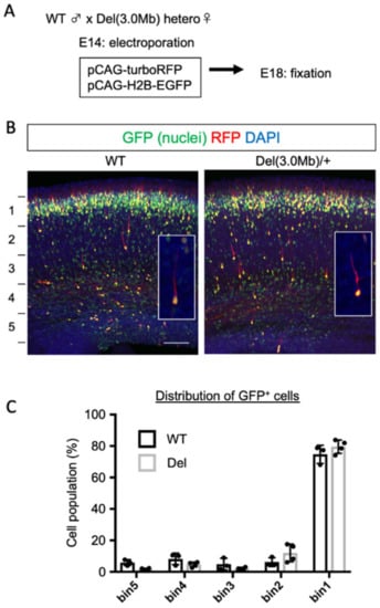 The genome region deleted in Del(3.0Mb) mice includes more than 40 genes, most of which are expressed in the embryonic brain [28], raising the possibility that some aspects of brain development may be altered. During brain development, cortical excitatory neurons migrate from the ventricular zone toward the brain surface. This process is frequently affected by blocking the expression of genes involved in the brain development [29]. We, therefore, examined this possibility in embryonic Del(3.0Mb)/+ mice. Del(3.0Mb)/+ and WT mice were crossed and the resulting embryos were electroporated in utero with pCAG-H2B-EGFP (0.3 mg/mL) together with pCAG-turboRFP (0.5 mg/mL) at E14 (Figure 1A). The embryos were fixed 4 days later (E18), and we examined the distribution of cells labeled with EGFP (nuclei) and their individual cell morphology visualized by turboRFP (cytosol). The labeled cells in WT embryos mostly migrated to the superficial layer of the cortical plate (bin1), and those in Del(3.0Mb)/+ embryos in the same litter also reached the same position (Figure 1B,C). The morphologies of migrating neurons with a thick leading process pointing to the brain surface were not affected in Del(3.0Mb)/+. Hence, the radial migration of cortical excitatory neurons is thought to be normal in Del(3.0Mb)/+ mice.