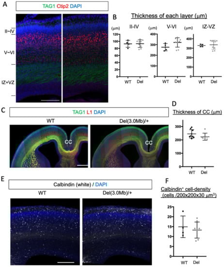 We next examined the layer structure of embryonic cortical plates, which can be disturbed by altered neurogenesis, migration, and apoptosis. To assess this, we stained the coronal sections of E18 WT and heterozygous brains with Ctip2, a layer V and VI marker [30], and TGA1, a maker for cortico-fugal and cortical commissure axons [31] (Figure 2A). We measured the thickness of 3 sectors; from layer II to IV (above the Ctip2 positive sector), layers V and VI (Ctip2 positive sector), and from the IZ to the VZ (from the TAG1 positive area to the ventricular surface) in the somatosensory area. However, we could not detect significant changes between the two genotypes in any sectors (Figure 2B). We also examined immunohistochemistry of TAG1 and L1, a pan-axonal marker [32], in coronal sections and found that there was no gross difference in the axonal tracts in the E18 brains (Figure 2C). The thickness of the corpus callosum was not significantly changed between WT and Del(3.0Mb)/+ (Figure 2D). A previous study reported that the migration of interneurons from the medial ganglionic eminence to the cerebral cortex was impaired in E18 Df1/+ mice, which is another 22q11.2DS model carrying a 1.5 Mb deletion [33]. We therefore evaluated the density of interneurons using an early marker, calbindin [26,34], in the Del(3.0Mb)/+ embryonic cerebral cortex at E18; however, there was no significant change compared to WT (Figure 2E,F). These observations indicate that there is no noticeable defect in the cortical development in Del(3.0Mb)/+ mice.