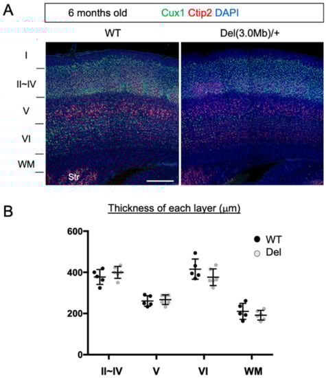After birth, the dendrite arborization, axon extension, synapse formation, and myelination proceed, which establish the mature layer structures of the cerebral cortex in an area-specific manner. We examined this in adult heterozygous mice. We immunostained the adult brains (6 months) with Cux1, a marker for layer II to IV neurons [35] (and scattered staining can be observed in the lateral part of layer VI), and Ctip2, which is expressed both in layer V and layer VI neurons (Figure 3A). However, the layer V neurons expressed higher Ctip2 and their cell size was larger than layer VI neurons, which enabled us to distinguish them. Based on these features, we identified layers II~IV, V, VI, and white matter in the somatosensory area and measured their thickness (Figure 3B). As a result, we did not detect any changes between WT and heterozygote mice at the level of gross histology.