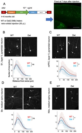 Dendritic arbors of subsets of neurons in adult Del(3.0Mb)/+ are slightly but significantly reduced. (A) Experimental design for visualization of individual neurons using EGFP-expressing AAV vector. About 50 µL of AAV solution in low titer (1011 virus genome (vg)/mL) was administered to adult (6 months old) mice via the retro-orbital route. These mice were fixed 7 days after the injection. Representative image of a sagittal section of the WT brain was shown (right). Scale bar: 500 μm. (B–E) Representative images of GFP+ individual neurons in various brain regions of WT or Del(3.0Mb)/+. Scale bars: 50 μm. The complexity of dendrite branches was quantified with Sholl analysis (bottom of each panel). Error bars indicate ± SD. The red lines and blue lines in the graphs represent WT and Del(3.0Mb)/+, respectively. The number of intersections in a range of 20–100 μm in the WT and Del(3.0Mb)/+ mouse brains were analyzed with two-way ANOVA (distance from soma and genotypes). The dendrite branches were significantly reduced in Del(3.0Mb)/+ medial prefrontal cortex (mPFC) (C) and nucleus accumbens (NAc) (E), while no significant changes were observed in the somatosensory area (S1) (B) and striatum (Str) (D). (B) WT: 20 neurons from 4 brains, Del: 18 neurons from 4 brains, F (1, 36) = 0.6035, p = 0.4423. (C) WT: 15 neurons from 3 brains, Del: 19 neurons from 5 brains, F (1, 32) = 4.585, p = 0.0400. * p < 0.05. (D) WT: 26 neurons from 3 brains, Del: 24 neurons from 5 brains, F (1, 48) = 0.2107, p = 0.6483. (E) WT: 18 neurons from 4 brains, Del: 21 neurons from 5 brains, F (1, 37) = 5.811, p = 0.0210. * p < 0.05. p values are for comparisons between WT vs. Del(3.0Mb/+). The interaction effects were not significant in (C,E).