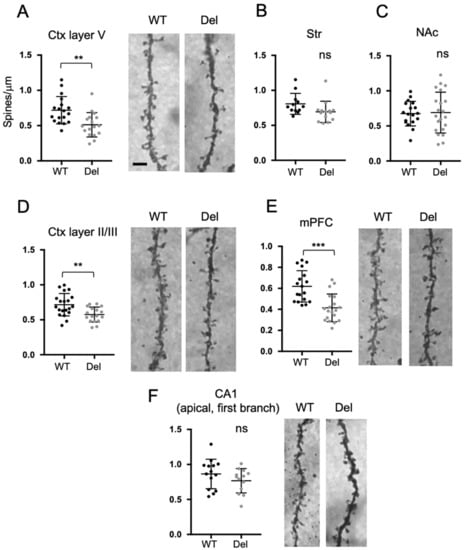 An anomaly in dendritic spine formation is one of the key features of neurodevelopmental disorders. We next focused on this point, conducted a computer-assisted count of dendritic spines of AAV-labeled neurons. Consequently, the spine density of layer V pyramidal neurons was significantly reduced compared to WT in the somatosensory area of Del(3.0Mb)/+ mice, while there were no significant changes in medium spiny neurons in the striatum and NAc (Supplementary Figure S1). As an alternative method, we evaluated the spine densities using the Golgi–Cox staining method. In accordance with the results obtained from AAV-labeled neurons, the spine density of layer V neurons in the somatosensory area was reduced, and those of medium spiny neurons in the striatum and NAc were not significantly changed (Figure 5A–C). Additionally, we also found that the spine densities of layer II/III neurons in the somatosensory area and layer V neurons in the mPFC were reduced (Figure 5D,E). We could not detect a significant difference in the spine density of CA1 neurons (the first branch of apical dendrites) between Del(3.0Mb)/+ and WT (Figure 5F). This seems controversial to the previous study showing a slight decrease in LgDel mice, which is another 1.5 Mb deletion model [19]. That study demonstrated that the instability of spines increased, and both formation and elimination of spines increased in that mouse model, resulting in decreased spine density as a net movement. There is another study showing the instability of spines in Df(16)A+/−, another 1.5 Mb deletion model, and it showed unchanged spine density of CA1 neurons in the fixed brain [37]. Therefore, our observation is not necessarily contradictory to the previous studies. Taken together, the spine densities of pyramidal neurons in the somatosensory and mPFC were reduced, while those in basal forebrains and hippocampus were not.