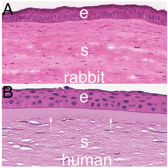 Hematoxylin and eosin staining of an anterior rabbit cornea (A) without Bowman’s layer and a human cornea (B) with Bowman’s layer (arrows). e is epithelium. s is stroma. Mag. 200×.