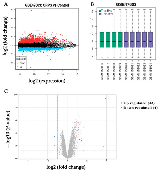The gene expression microarray GSE47063 (9 samples: 2 CRPS I, 2 CRPS II, and 5 controls) was downloaded from the Gene Expression Omnibus (GEO) database (http://www.ncbi.nlm.nih.gov/geo, accessed on 5 November 2022), a subdataset of the National Center of Biotechnology Information (NCBI), which includes biological expression data of many species obtained via array, SNP array, and high-throughput sequencing [11]. All datasets in the present study were downloaded from public databases. These public databases allowed researchers to analyze for scientific purposes, and thus ethics approval was not required.