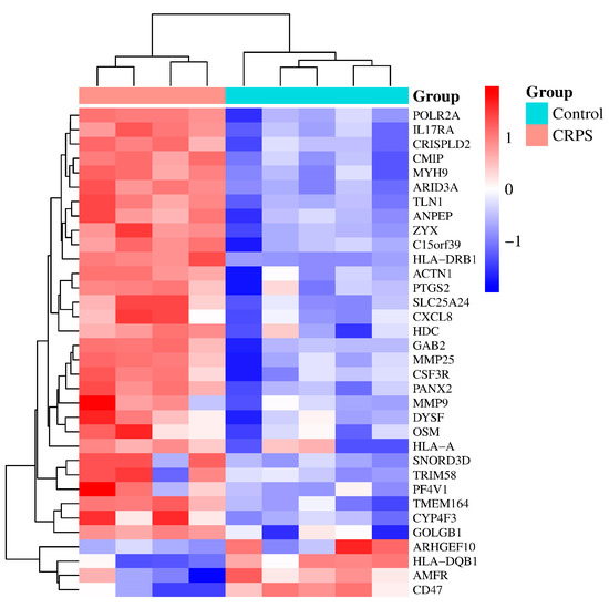 We downloaded the gene expression series matrix, platform information, and clinical information from the GEO database. Then, the corresponding platform information was used to convert the probe IDs in the expression series matrix into gene symbols to obtain an international general expression series matrix with the row name of gene symbols and the column name of sample names. The mean value of multiple probe sets was calculated if they corresponded to the same gene. Next, we further used the tool of GEO2R (http://www.ncbi.nlm.nih.gov/geo/geo2r/, accessed on 5 November 2022) to analyze the differentially expressed genes (DEGs) in the CRPS group and the Control group. Results are presented in the browser as a table of the top 250 genes ranked by p-value, for RNA-seq; the table is the result of the Wald test when comparing 2 groups of samples. Highlighted genes are significantly differentially expressed at a default adjusted p-value cutoff of 0.05 (red = upregulated, blue = downregulated). The DEGs were defined as genes with a p-value < 0.05 and a |log (fold change (FC))| ≥ 1.