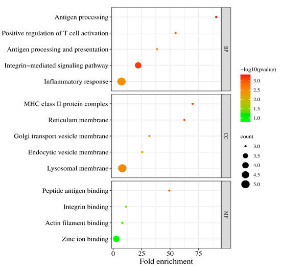 We performed the GO functional annotation and KEGG pathway enrichment analysis on the 37 DEGs. For biological processes (BPs), these DEGs mainly involved antigen processing, T cell activation, the integrin-mediated signaling pathway, and inflammatory response. For the cellular component (CC), the DEGs were associated with the MHC class II protein complex, reticulum membrane, golgi transport vesicle membrane, endocytic vesicle membrane, and lysosomal membrane (Figure 3).