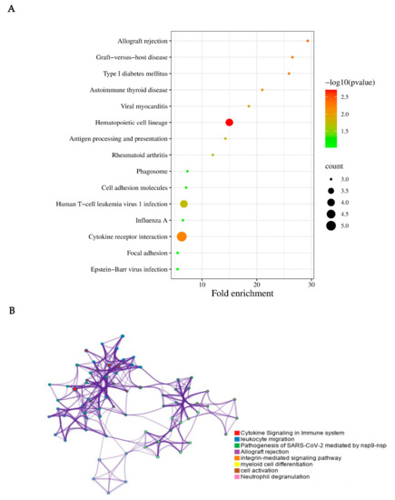 KEGG pathway enrichment analysis of the integrated DEGs. (A) KEGG pathway enrichment analysis on the 37 DEGs. The cytokine receptor interaction, human T-cell leukemia virus 1 infection, and hematopoietic cell lineage may play important roles in CRPS. (B) Visual analysis was performed using Metascape. In consideration of the result performed via Metascape, the cytokine signaling in the immune system, leukocyte migration, pathogenesis of SARS-CoV-2, allograft rejection, integrin-mediated signaling pathway, myeloid cell differentiation, cell activation, and neutrophil degranulation were closely associated with CRPS.