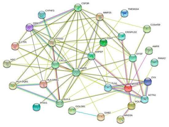 The STRING database (STRING: functional protein association networks (string-db.org, accessed on 8 November 2022)) is an online search for known and predicted protein interactions [13]. At present, it stores at least 14,094 kinds of organisms, 67.6 million kinds of proteins, and more than 20 billion interaction data. We uploaded 37 DEGs to the string database and visualized a PPI network map of the String database using Cytoscape software. In Cytoscape, each gene was considered as a node and experimentally determined interactions were used as edge attributes. The important modules were identified and visualized using Molecular Complex Detection (MCODE), which is a plugin in Cytoscape for discovering densely connected nodes in a given network. We further used the MCODE module to calculate the core interactions in the PPI network and the Clugo to further analyze the key pathways.