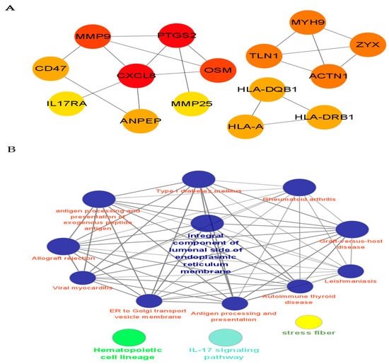 PPI network analysis and identification of hub genes. (A) We identified the top hub genes (MMP9, PTGS2, CXCL8, OSM, TLN1) associated with CRPS. (B) Cytoscape provides basic functionality to lay out and query the network associated with CRPS; to visually integrate the network with expression profiles, phenotypes, and other molecular states; and to link the network to databases of functional annotations [14]. The potential mechanism of CRPS is analyzed via the PPI network.