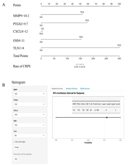 Nomogram for predicting CRPS. (A) According to the score of each independent variable, the vertical projection to the uppermost points score axis can correspond to a score, and finally all 5 independent risk factor variables are scored and counted. (B) Based on the hub genes, dynamic nomograms are plotted. For example, patients with scores for MMP9 > 10.2, PTGS2 > 9.7, CXCL8 > 12, OSM < 11, and TLN1 < 8; the prediction rate of CRPS is about 79%.