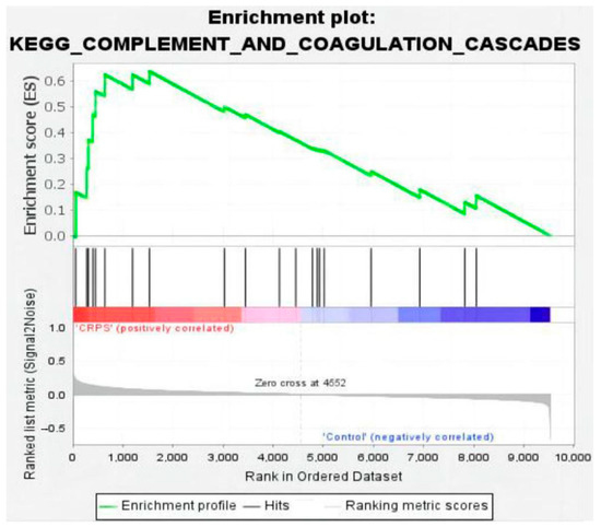 At the same time, GSEA employs a competitive null hypothesis to test significance; thus, we screened out one commonly significant enriched pathway through GSEA analysis (Version 4.3.2): the system of complement and coagulation cascade cascades affected by inflammation (Figure 8). Collectively, the complement and coagulation system is a part of the innate immune system, comprising more than 50 soluble and membrane-bound proteins that mediate inflammatory responses and defend against microbes [15]. Complement activation leads to the generation of C3a, C5a, and the membrane attack complex (C5b-9), which causes a release of pro-inflammatory and procoagulant cytokines such as TNF and in IL-6 associated with CRPS. In our study, the power of GSEA lies in its use of gene sets, which provide a more stable and interpretable measure of biological functions and can show greater experimental and technical variation.