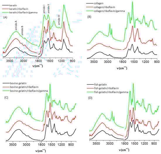 In addition to the vibrational modes observed for keratin, the collagen (Figure 1B), bovine gelatin (Figure 1C), and fish gelatin (Figure 1D) samples exhibited bands in the spectral region of 1000–1100 cm−1 that have been interpreted considering the glycation of collagen, and thus ascribed to C-O stretching vibrations of carbohydrates [31]. The main spectral changes induced by gamma irradiation of these samples occur in the spectral regions attributed to C-H stretching and C-H bending vibrations. Thus, irradiation produces a strong increase in the intensity of the C-H asymmetric and symmetric stretching bands, accompanied by a strong decrease in the C-H bending mode at ~1405 cm−1. For collagen and bovine gelatins, a shift of the amide II band from ~1547 cm−1 in the native samples to ~1540 cm−1 in the samples containing riboflavin and in the irradiated samples is also observed. Some authors explain such a shift to lower wavenumbers by the fibrillogenesis of collagen [31].
