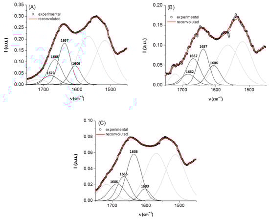 Deconvolution of the amide I region of the IR spectra of keratin samples: (A) keratin, (B) keratin/riboflavin, (C) keratin/riboflavin/gamma-irradiated; for clarity, band components not belonging to the region of interest are depicted in grey.