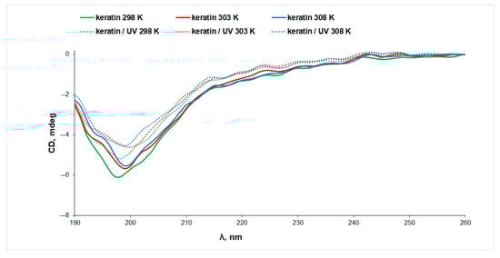 The CD spectra of aqueous keratin solutions in the absence and presence of riboflavin, prior to and after exposure to UV radiation, at three temperatures, are presented in Figure 3. It is known from the literature [32] that the α-helical CD spectrum of α-keratin shows two negative minima at 222 nm and 208 nm, and a positive maximum at 190 nm. The CD spectra presented in Figure 3 display a single broad negative peak at ~200 nm, indicating a low content of α-helix conformation in the case of our keratin sample. This observation is in agreement with the helical content of only ~28% estimated from IR data.