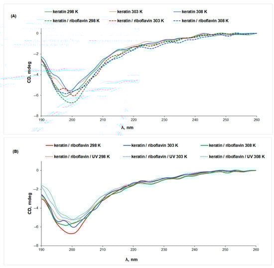 Both the increase in temperature and the exposure to UV radiation determine a decrease in the CD signal of keratin, pointing to changes in the protein secondary structure associated with protein denaturation. More intense CD signals were obtained for keratin samples in the presence of riboflavin, indicating a stabilizing effect of riboflavin on the protein structure as a result of interaction (Figure 4A). This observation can be correlated to the slight increase in the content of ordered structures at the expense of the random coils, which decrease from 42% in keratin to 35% in keratin/riboflavin (Table 1).