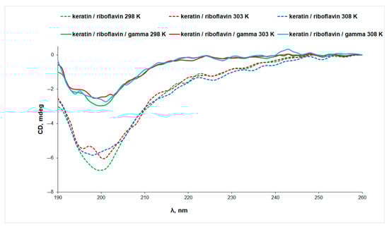 The CD spectra of keratin/riboflavin (line) and keratin/riboflavin/gamma-irradiated (dotted line) aqueous solutions measured at different temperatures.